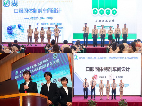 2018年8月14-17日,由教育部高等学校药学类专业教学指导委员会主办,江南大学承办,中国医药集团联合工程有限公司、上海东富龙科技股份有限公司和无锡市食品药品监督管理局协办的第八届“国药工程-东富龙杯”全国大学生制药工程设计竞赛东部赛区决赛隆重举行,经过竞赛专家委员会匿名评审评出的20支精英团队前来无锡参赛,共有来自全国约50所高校的近300名师生共同观看了比赛。